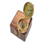 The image shows a vintage brass compass placed next to a wooden storage box.
