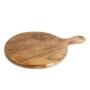 This wooden serving board is beautifully crafted with a smooth, round surface and a convenient handle for easy carrying. The natural wood grain adds a warm and elegant look, making it perfect for serving snacks or appetizers. Its slightly raised edges help keep food from sliding off, adding practicality to its design. The board is sturdy and durable, ideal for everyday use or special occasions. Its polished finish highlights the rich texture of the wood, giving it a rustic yet sophisticated appeal. This versatile board can also be used for food presentation or as a decorative piece. Easy to clean and maintain, it combines function with style. Its size is perfect for serving small to medium portions. Made from sustainable wood, it is eco-friendly and safe to use. Overall, it is a charming and useful addition to any kitchen.